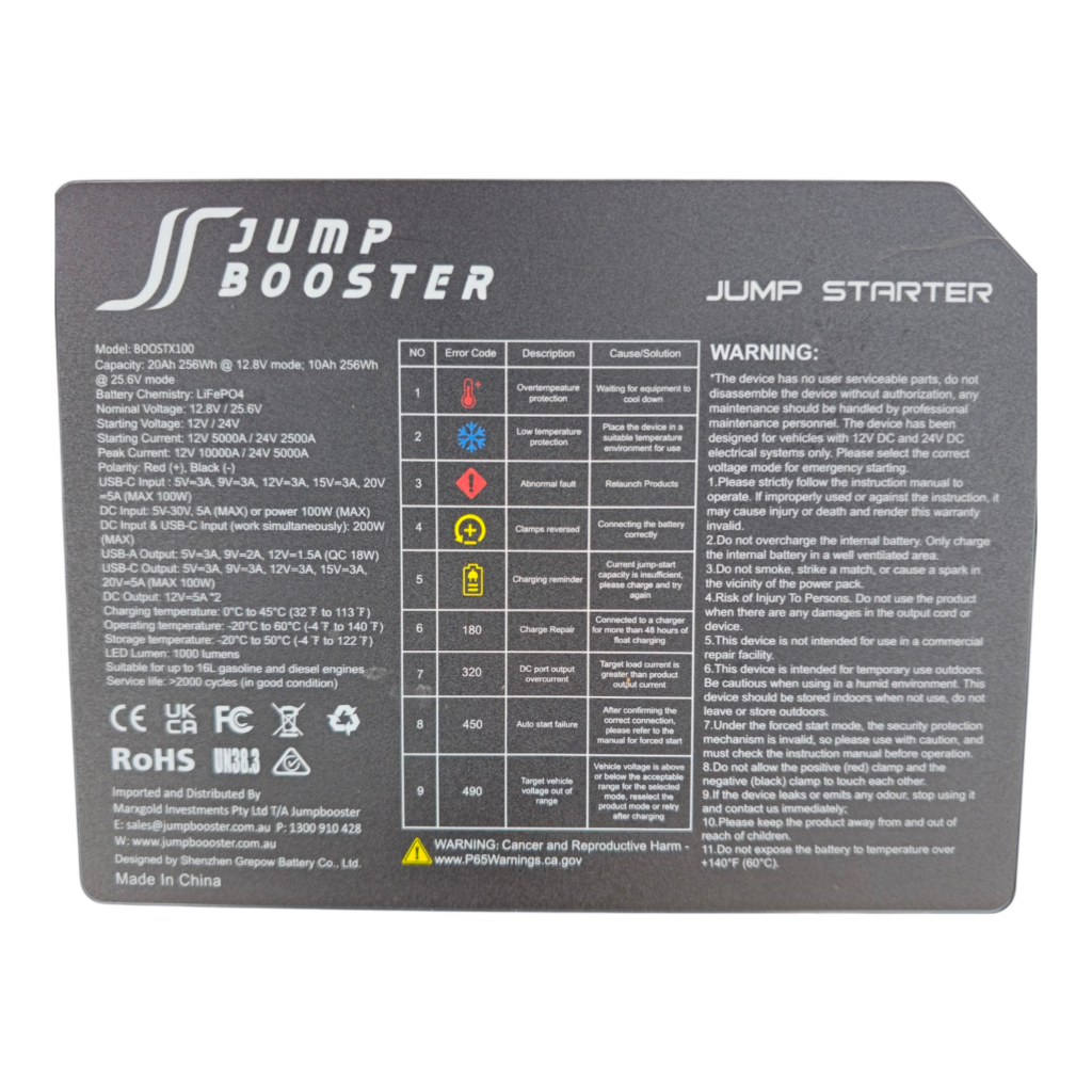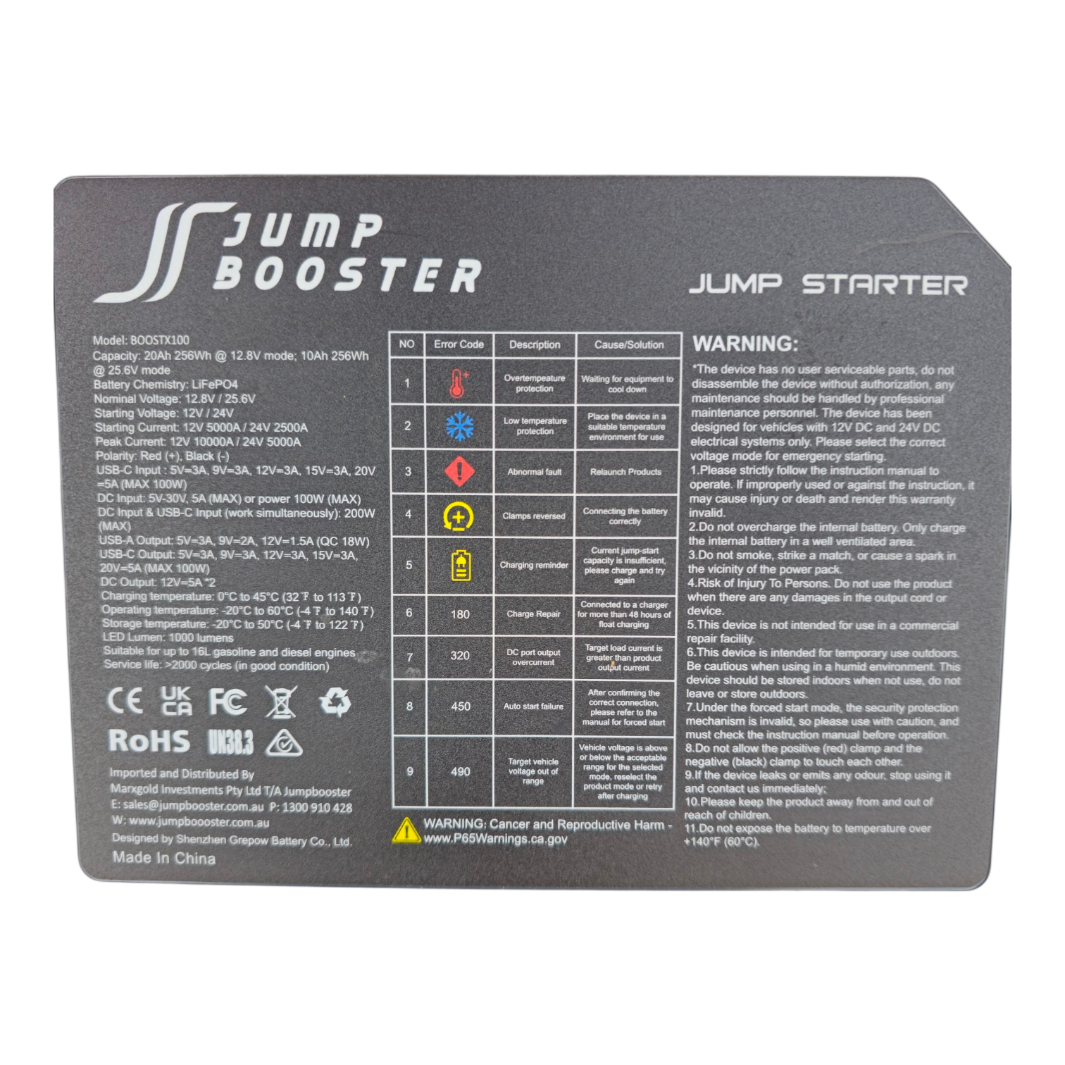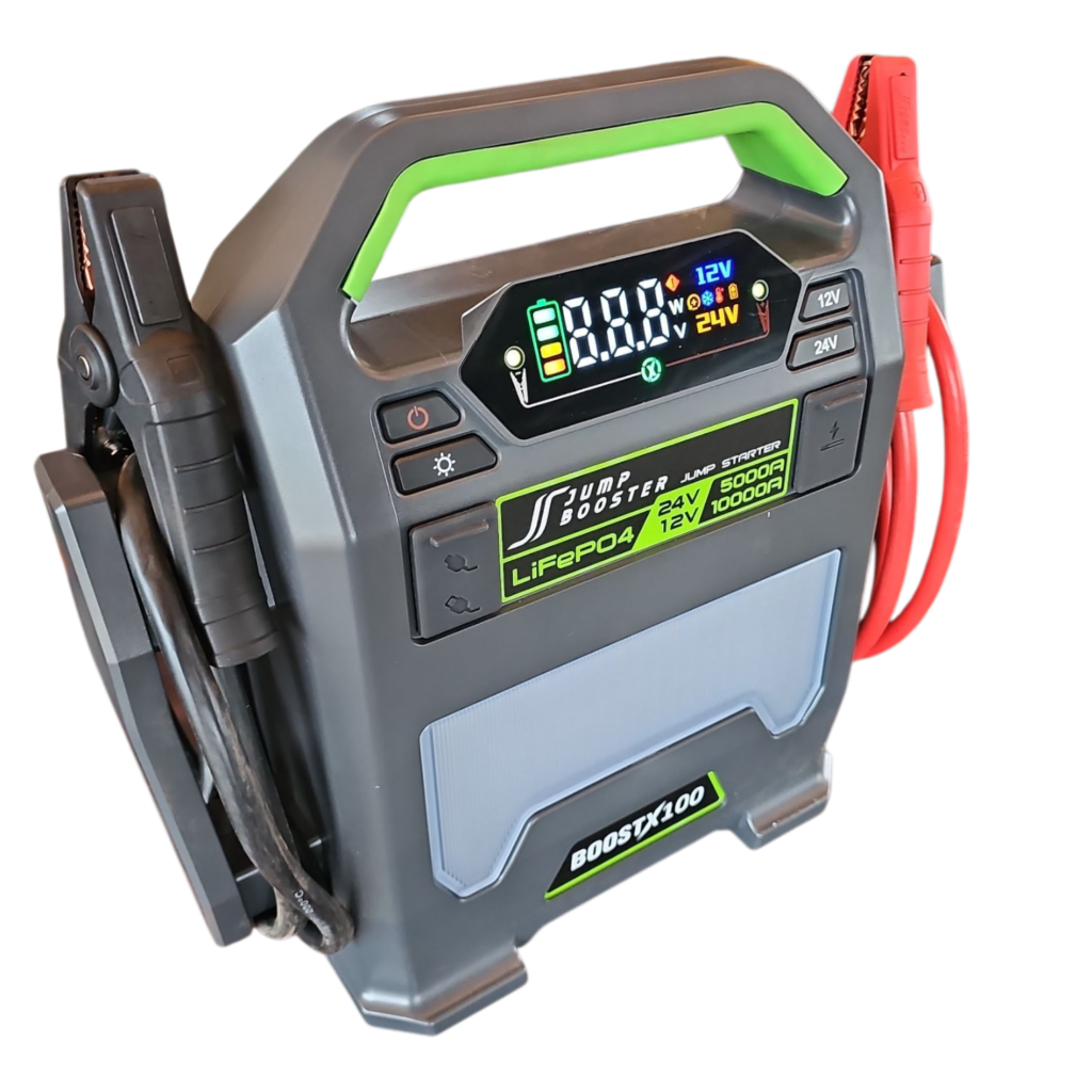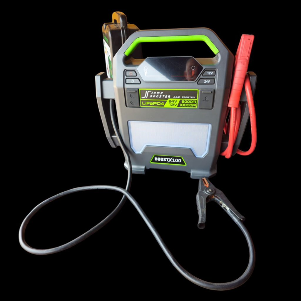 Capable of outputting up to 10000 peak amps and 4000 constant crank amps in 12 volt and 5000 peak amps and 2000 constant crank amps in 24 volt, the BoostX100 is a must have for all industries including trucking, earthmoving, farming, mining and mechanical workshops. Great for 4×4’s and travelling around Australia as well. It has 19.4 AH of liFePO4 battery storage for running lights or fridges. A 100 watt type C outlet for keeping all those devices charged, 2 x 12 volt outlets 5 Amp each, if you have a flat battery, no need to worry, the BoostX100 will start everything and anything, it does not matter what it is. there is not a vehicle, truck or piece of equipment around that the Jumpbooster BoostX100 will not start so if you own a trucking company, earthmoving company, mechanical workshop, diesel maintenance, farming enterprise, involved in mining, multiple vehicles, or just travelling around Australia in a 4×4 and caravan and you want the best reliable lightweight jump starter you can buy, the BoostX100 is the ultimate jump starter for you. Backed by our 3 year pro rata warranty, we ensure our products are the best value you can buy and will definitely do the job you need.