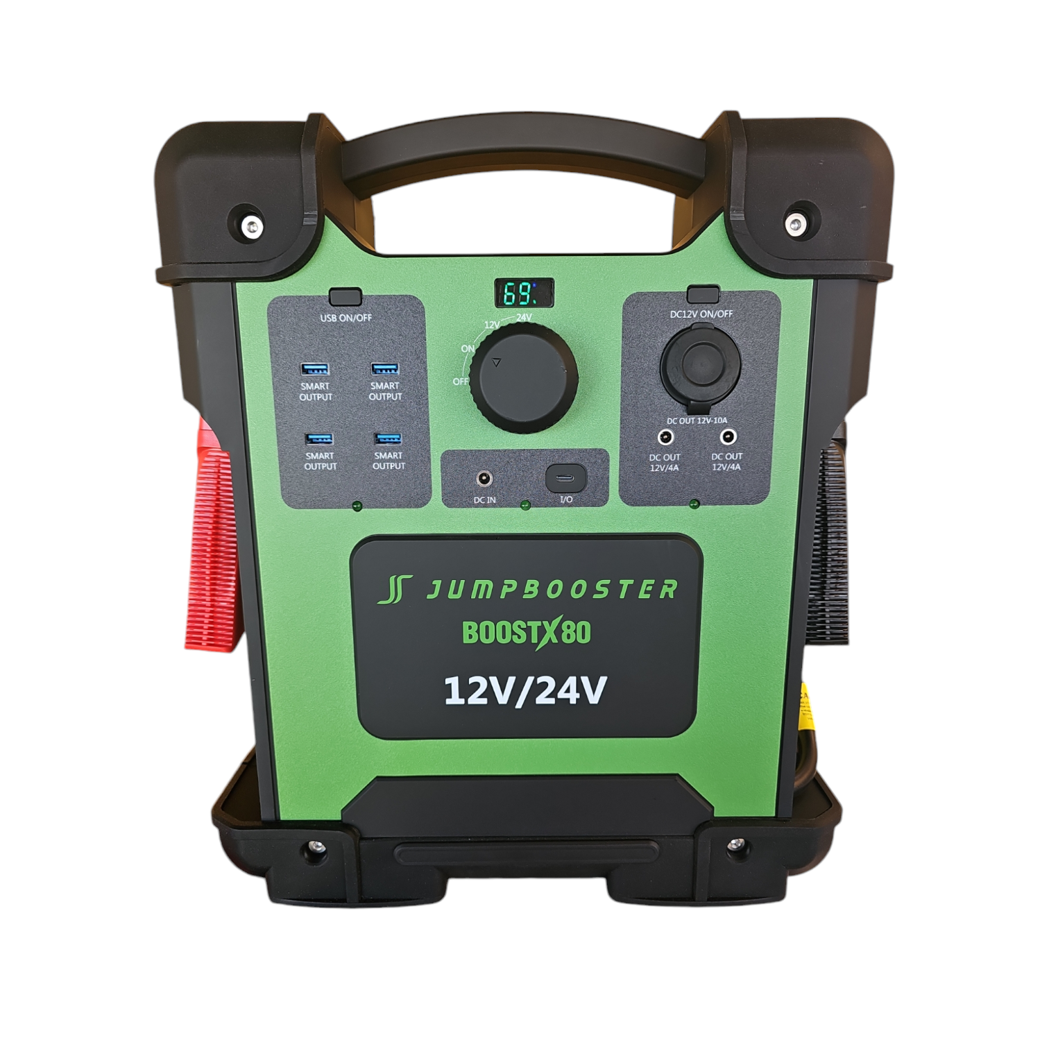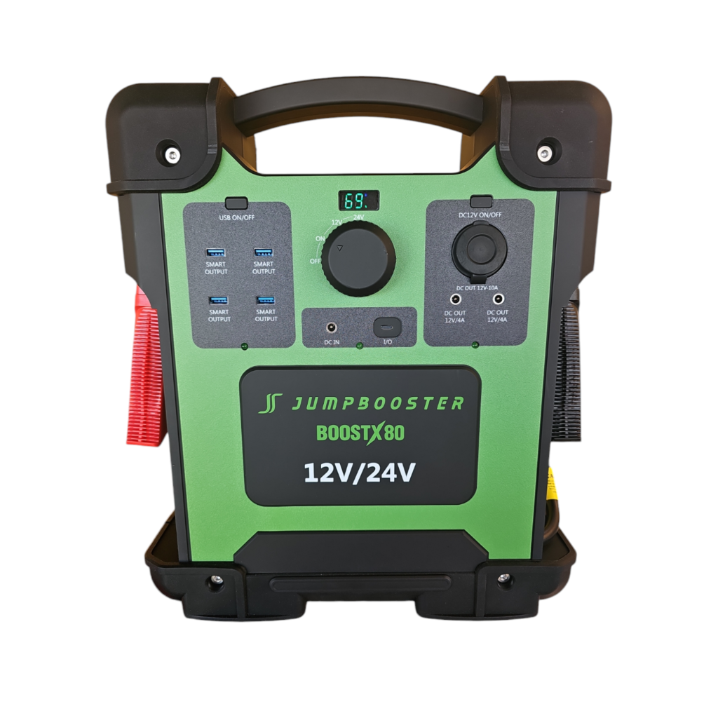 Capable of outputting up to 15000 peak amps and 3000 constant crank amps in 12 volt and 6000 peak amps and 2000 constant crank amps in 24 volt, the BoostX80 is a must have for all industries including trucking, earthmoving, farming, mining and mechanical workshops. Great for 4×4’s and travelling around Australia as well. It has 20 AH of lithium battery storage for running lights or fridges. 4 x USB’s and a type C outlet for keeping all those devices charged, 3 x 12 volt outlets including a 10 Amp cig outlet and don’t worry, if you have a flat battery, no need to worry, the BoostX80 will start anything, it does not matter what it is. At least 5 times more powerful than any other lithium jump starter on the market and providing 15000 Amps of peak power, yes not a typo, 15 thousand amp’s of peak power. there is not a vehicle, truck or piece of equipment around that the Jumpbooster BoostX80 will not start so if you own a trucking company, earthmoving company, mechanical workshop, diesel maintenance, farming enterprise, involved in mining, multiple vehicles, or just travelling around Australia in a 4×4 and caravan and you want the best reliable lightweight jump starter you can buy, the BoostX80 is the ultimate jump starter for you. Backed by our 3 year pro rata warranty, we ensure our products are the best value you can buy and will definitely do the job you need.