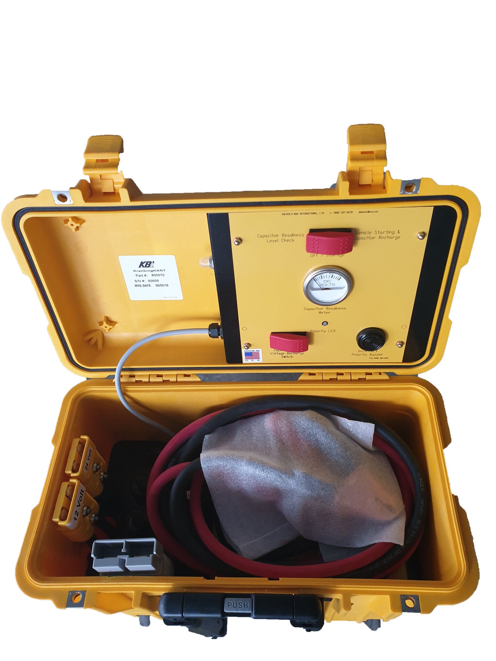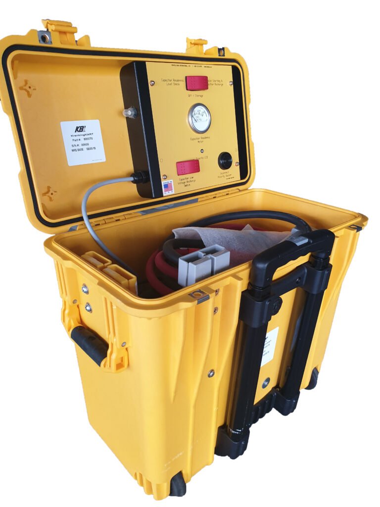 The KrankingKART JR is and industrial jump starter capable of starting diesel engines up to 18 litres. The KKJR does not have batteries and requires no maintenance during its service life of up to 20 years. Simple to use and has lock out protection, indication LED light and a buzzer to ensure polarity and voltage is correct on connection. Extremely powerful and reliable, the heart of the KrankingKART JR is the KAPower supercapacitor. The KAPower supercapacitors are initially energized from a vehicle’s electrical system. KAPower supercaps then stores the energy until needed. KAPower supercaps have a long service life upwards of 1,000,000 cycles and can outlast all other jump starters. The KAPower is virtually unaffected by temperatures and is maintenance free. Made in the USA the KrankingKART jump starter range will revolutionizeton the jump starting industry with its unprecented power and reliablilty and 90 second full recharge ability.
